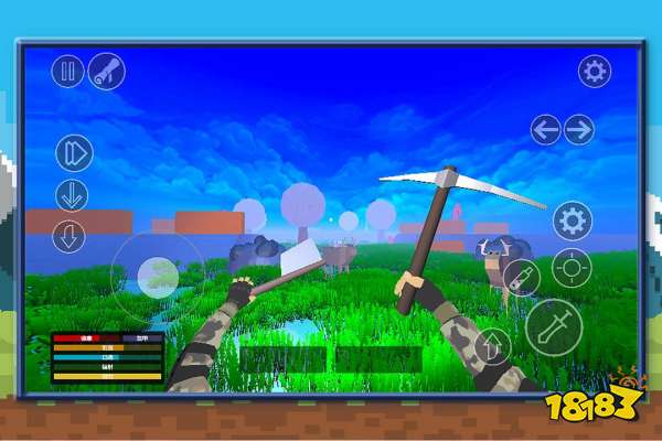 《狩猎生存模拟》这款游戏的画风是非常不一样的,大家可以看到连片的白天和绿草相连接,在这样的场景下,生存模式也变得更加的休闲,一开始的时候,大家的画面中只会出现两只手,没错,就是第一人称的视角。大家刚开始获取的道具也是非常简单的一些武器道具,根据后面的升级,大家才会获取杀伤力更大的武器。
