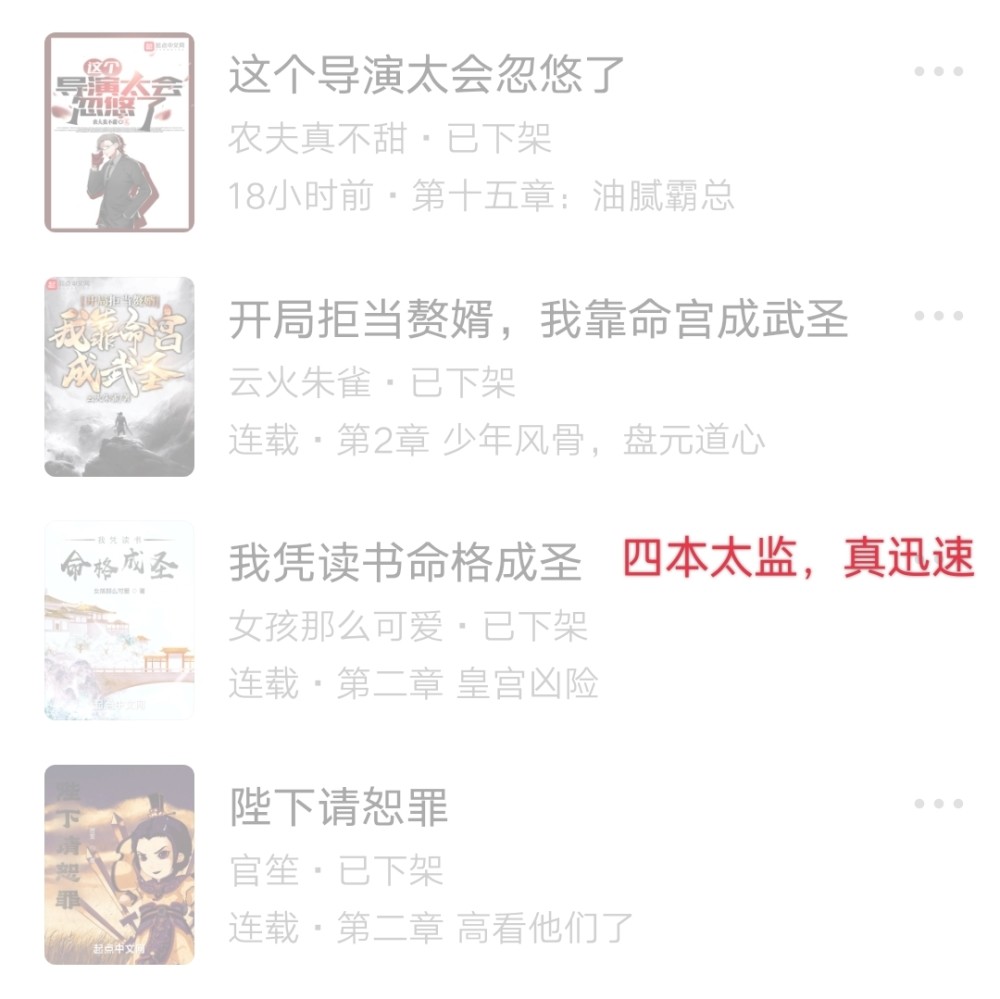 今天去看我的新书书架的时候,发现有四本新书直接下架了,其中一些作品是直接删文的。