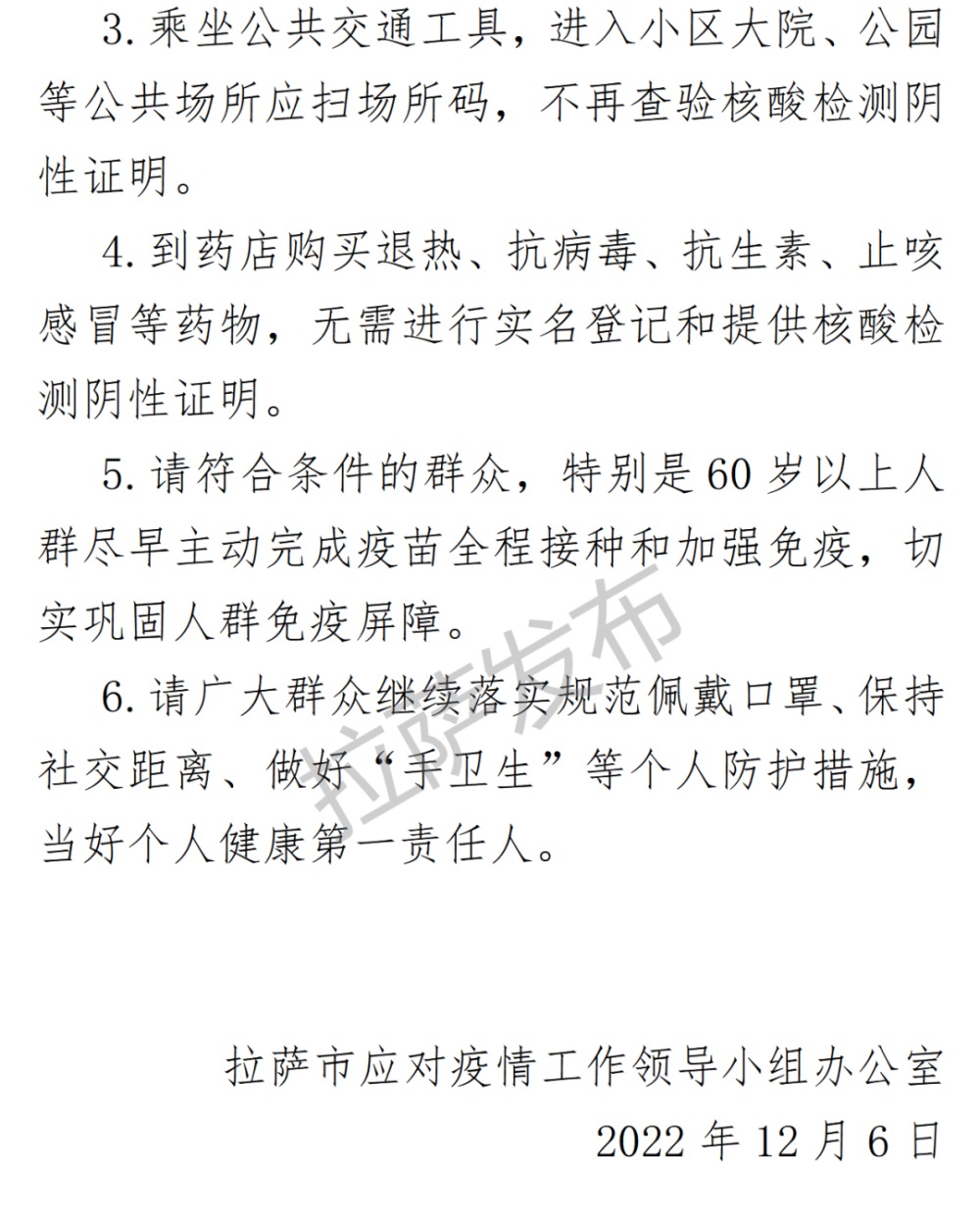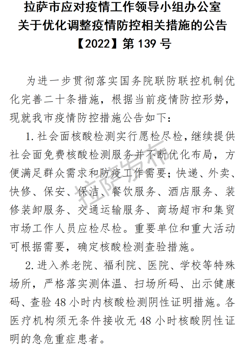 12月6日晚,西藏拉萨市发布了关于优化调整疫情防控相关措施的公告。公告指出: