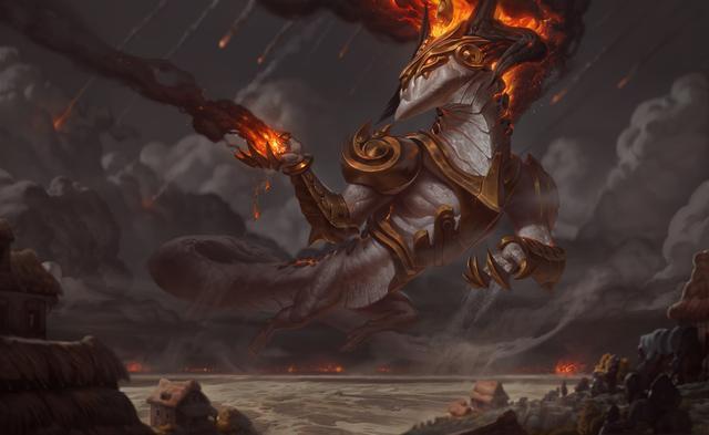 这款皮肤的原画也很出色,构图上,庞大的身躯很完整的体现出来了,这款皮肤给人一种高高在上的感觉。技巧上,光线线条也非常流畅,火焰的效果十分逼真。不愧是地狱火系列的头头啊,原画都有一种天灾的史诗感。