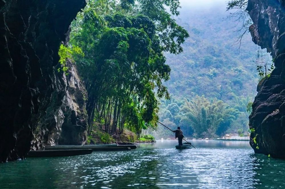 四面环山,因其独特的喀斯特地形地貌、溶洞、河流及村落,村里人进出村子必坐船穿过溶洞,这里就是进入世外桃源坝美村洞口,这里是进入景区的唯一通道