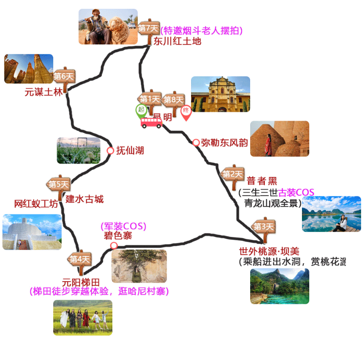 普者黑-元阳梯田-世外桃源坝美-东川红土地-元谋土林-建水古城-抚仙湖-碧色寨-弥勒东风韵深度游
