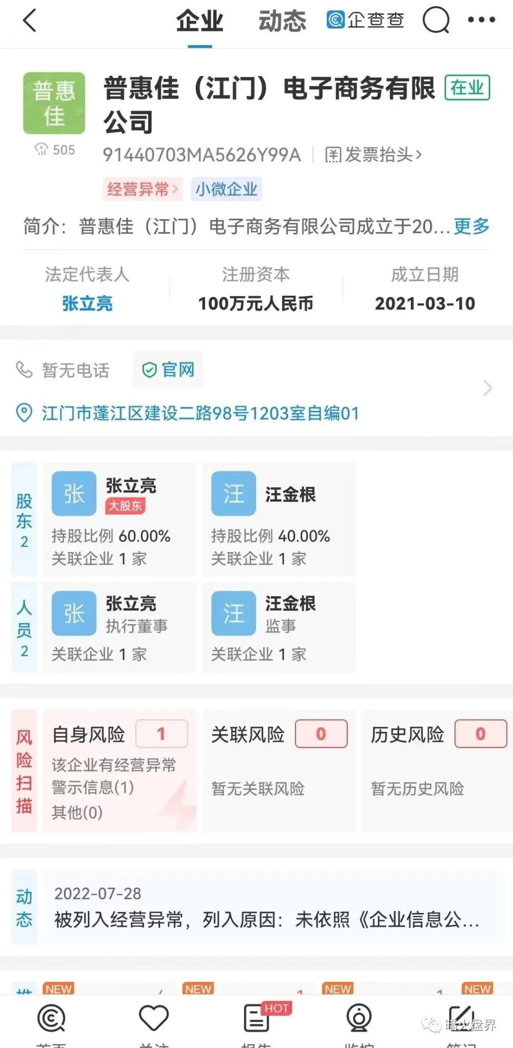 公司背书就牛了,这个院那个集团的,包装得有模有样,可结果一看对公账户,用的是支付宝收的款,暗火傻眼了,居然是一家名叫“普惠佳(江门)电子商务有限公司”的企业,而且还是一家空壳公司,各位可以自己查一查。不是说公司很有实力吗?怎么现在是家空壳公司收款呢?据暗火了解,“心想事成”商城的后台技术姓张,而这家公司的法人也姓张,好巧哦!