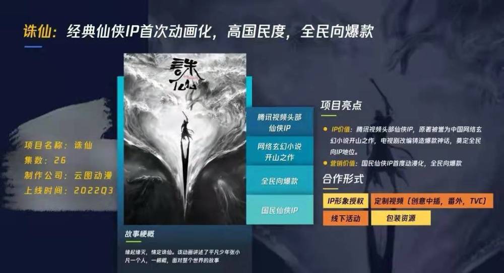从鹅厂发布的2022年国漫营销图鉴来看,里面提到《诛仙》这部作品。值得一提的是,根据鹅厂划分,共分四个单元,分别是“英雄宇宙年番” ,“侠义江湖” 和“青春梦想世界” 以及“原创幻想星球”,里面都是一些出名的作品。