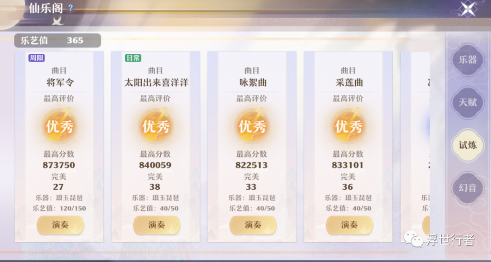 试炼玩法包含周常试炼和日常试炼,玩家可演奏已解锁乐器的曲谱进行挑战。仙乐阁将根据演奏的实际表现给出通关评价和对应的乐艺值,在试炼中得到的评价越高,则获得的乐艺值也就越多。