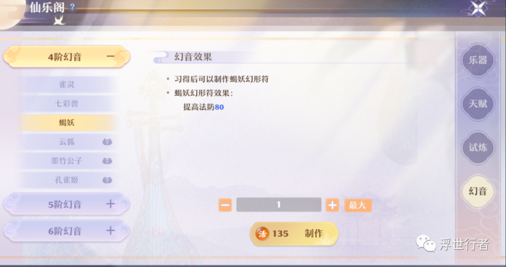 天赋中包含幻音类天赋,解锁后可制作对应幻形卡,高级天赋制作的幻形符将附带额外属性。制作幻形符需要消耗活力,制作的幻形符只能赠送给好友(乐艺等级达到12级以上解锁对应天赋)或者自用,没有办法直接出售。