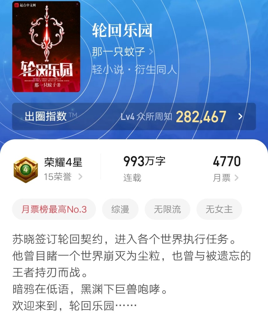 《轮回乐园》上半年一度是起点轻小说频道的热门作品,稳居榜首,近千万字剧情都不崩,人气和口碑双炸裂。