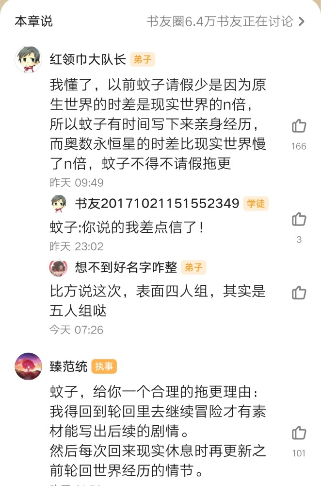 更有书友脑洞大开,对蚊子反复断更这件事做了艺术化的加工,仿佛真的找到了《轮回乐园》反复断更的原因。让人差点就相信,蚊子断更真的不是身体的原因了。