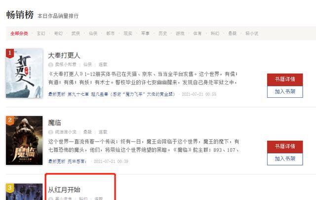 作为起点月票榜前十唯一一本科幻题材的小说,《从红月开始》有它自傲的资本,长期跃居于起点24小时畅销榜前十,并且稳居科幻类畅销榜第一。取得这样的成绩是以往科幻题材的小说中难以想象的!