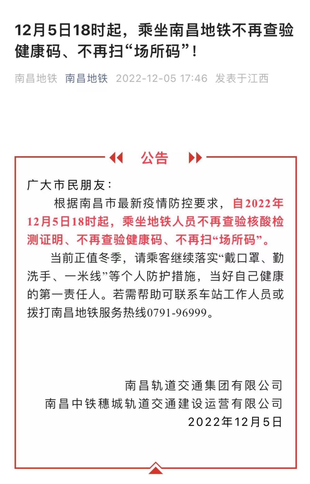 南昌是在12月5日下午6时开始调整最新防疫政策的,晚上6点半下班的小洪当天进地铁唯一感受便是:出乎意料地流畅。而在几个小时前,一早上班的她进入地铁还需要扫健康码才能进站。