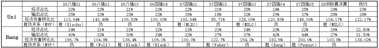 Bang和Uzi都是S2出道,Bang S5-S7连续3次入选S赛拳头官方top20,S5(第19,ADC位置第3)+S6(第6,ADC位置第2)+S7(第12,ADC位置第3);Uzi 4次入选S赛拳头官方top20,S4(第5,ADC位置第2)+S6(第11,ADC位置第4)+S7(第14,ADC位置第4) +S8(第1)。