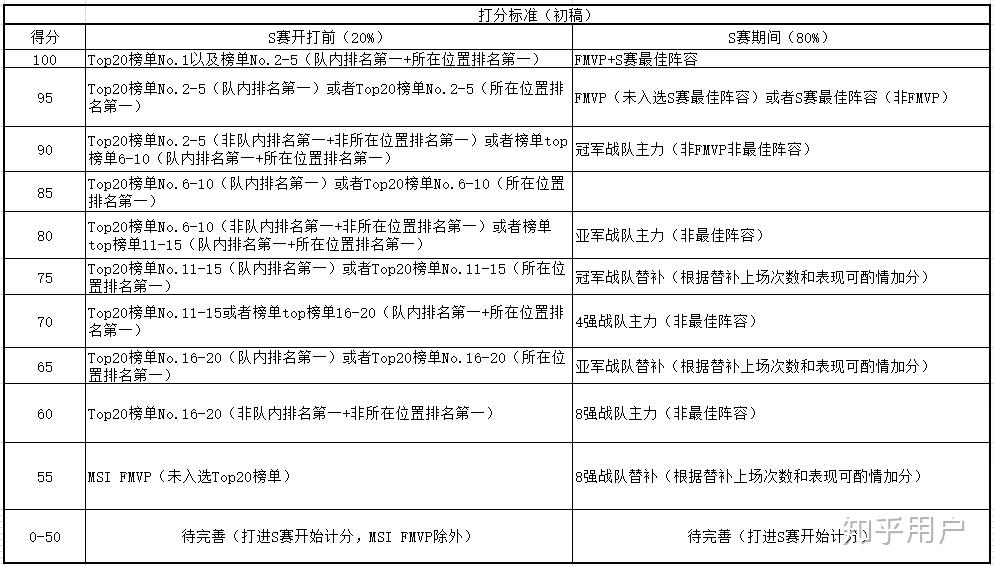 赛季评分标准是关键,以下是我的草稿,草稿,草稿,重要的事情说三遍,仅供参考而已。不认同可以自行建立打分标准,我只是提供一种思路,特别期待跟同好一起完善打分标准。