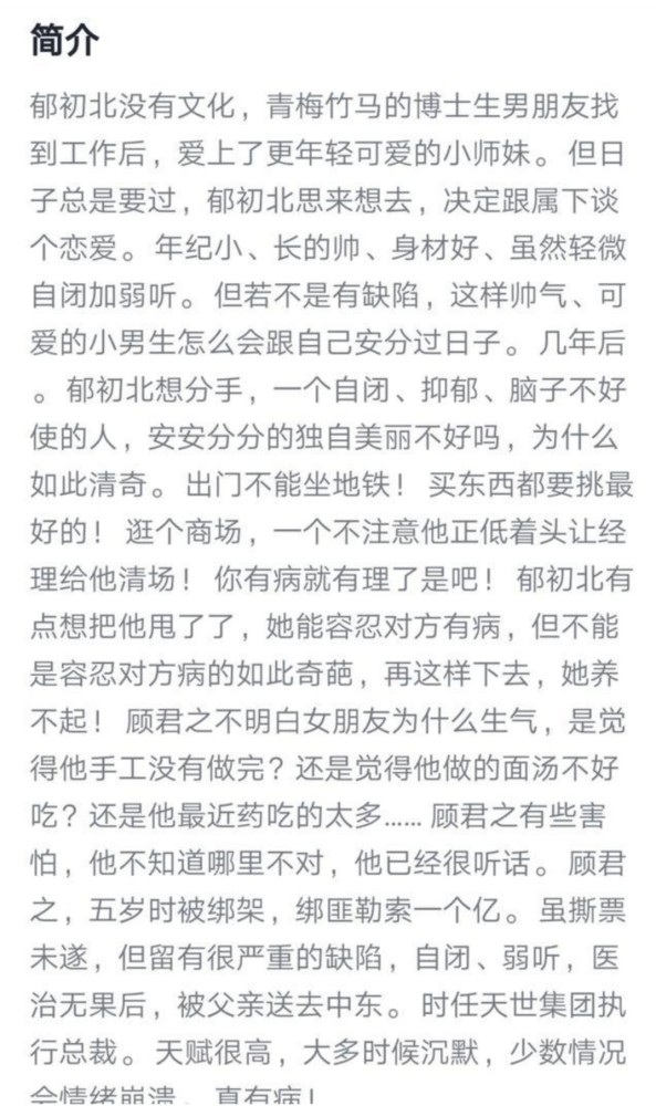 小说中的男主属于阴郁型男主。有人格分裂症,有四个人格,性格不同性格的男主。主人格顾君之,不喜欢与他人接触。女主不用担心有其他比女主更漂亮,更美丽的人去抢夺男主。因为一般有好看的女生去接触男主都被男主解决了。男主性格阴郁只喜欢和女主在一起。甚至不喜欢自己的孩子和女主在一起。很霸道。
