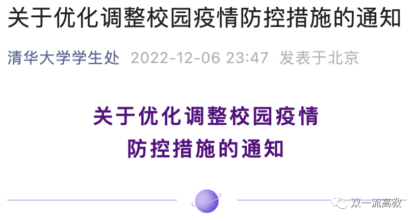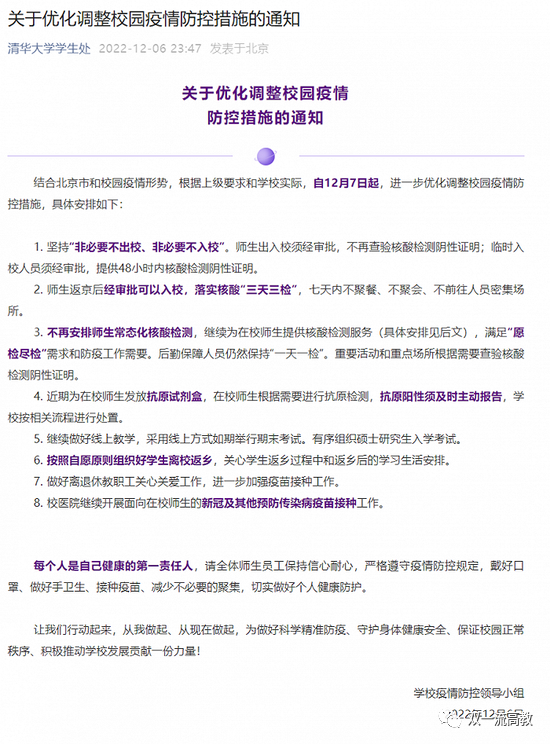 12月6日深夜23时47分,清华大学学生处发布《关于优化调整校园疫情防控措施的通知》:结合北京市和校园疫情形势,根据上级要求和学校实际,自12月7日起,进一步优化调整校园疫情防控措施。坚持“非必要不出校、非必要不入校”。师生出入校须经审批,不再查验核酸检测阴性证明;临时入校人员须经审批,提供48小时内核酸检测阴性证明。不再安排师生常态化核酸检测,继续为在校师生提供核酸检测服务,满足“愿检尽检”需求和防疫工作需要。通知全文如下: