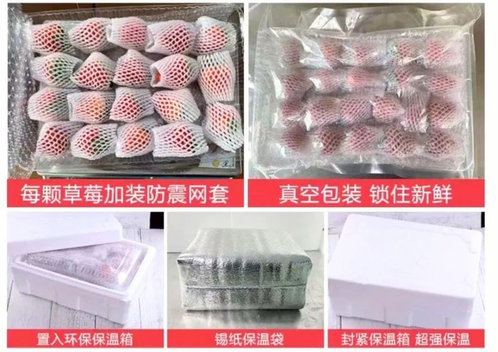 草莓皮肤娇嫩,这次的包装也格外用心,每颗草莓都加了防震网套,确保送到大家手上时都是完好如初的,真空包装锁住鲜美滋味,随后放入保温箱,还要再套入锡纸保温袋,四层超强的保温措施,呵护娇贵草莓。