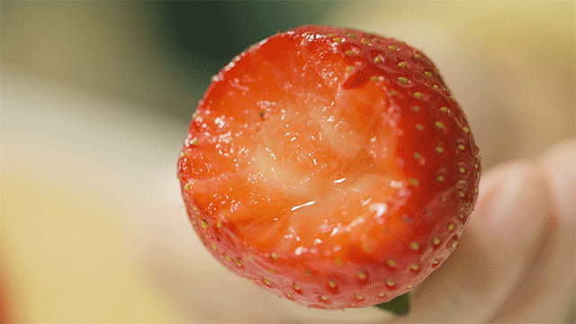 “咔哧”一口,立马会发现它和普通的草莓的区别。实打实的果肉内里没有空心,紧实鲜脆中又夹杂着恰到好处的柔软,每一口都带来水润甜美滋味。