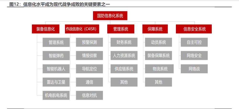军工信息化是当代战争的“神经网络”。大力发展信息化建设逐步成为全球 各国军力建设的共识,围绕 C4ISR 体系为核心的现代化军事体系是为各国提升军 事 信 息 化 水 平 的 关 键 : 集指挥( Command )、 控 制 ( Control )、 通 信 (Communication)、计算机(Computer)以及情报(Intelligence)、监视 (Surveillance)与侦察(Reconnaissance)功能于一体的高度集成的现代军事 信息控制体系平台。其中,通信系统承担着所有人员、计算机与武器(系统)之 间信息传递的“神经网络”角色,是信息化的底座和基石。