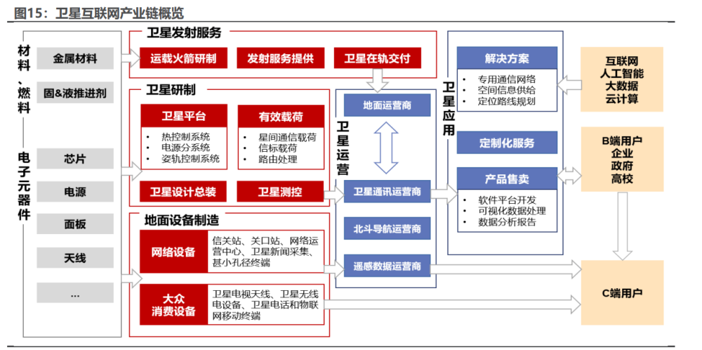 卫星产业链主要包括卫星研制、卫星发射、地面设备、卫星运营等环节。从 产业链上下游划分,卫星制造环节作为前端率先发展。类比地面基站通信,产业 首先在制造端起势,如 5G 基站建设,逐步发展到运营侧,建议首先关注卫星研 制环节。随着上游建设完成,卫星发射到位后,关注产业链后端的运营服务环节。