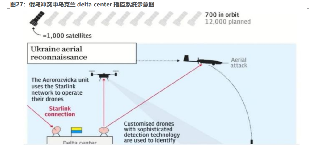 俄乌冲突中“星链”扮演关键角色。星链大量低轨卫星可率先抢占近地轨道 资源,且星链”卫星搭载了多种光学观测仪器,可实现 24 小时不间断光学监控分 析,通过大数据系统自动识别、分类追踪使得任何国家军队的调动将对美军单方 面透明。同时“星链“卫星具有一套自动轨道规避系统,处于不断动态调整及轨道 变化之中,可以进行蓄意攻击,因此可以利用密集的星链卫星网掌控太空。成体 系的星链卫星也能够提供低成本、全球覆盖的高精度高速互联网服务,借此美国 无人机的军事威胁大大增加。在俄乌冲突中“星链”卫星助力了乌克兰的军事行 动。乌方的 delta center 指控系统,集成了“星链”卫星的通信能力。“星链” 设备是固定使用的,无法安装在战斗机或无人机上直接接收卫星信号,因此是由 “星链”终端接收到情报和命令后通过设备本身的无线局域网转信给用户,以无 线网络的形式传播,可以在不需要大量基础网络设施的情况下,打造作战单位之 间的无线通讯网络。