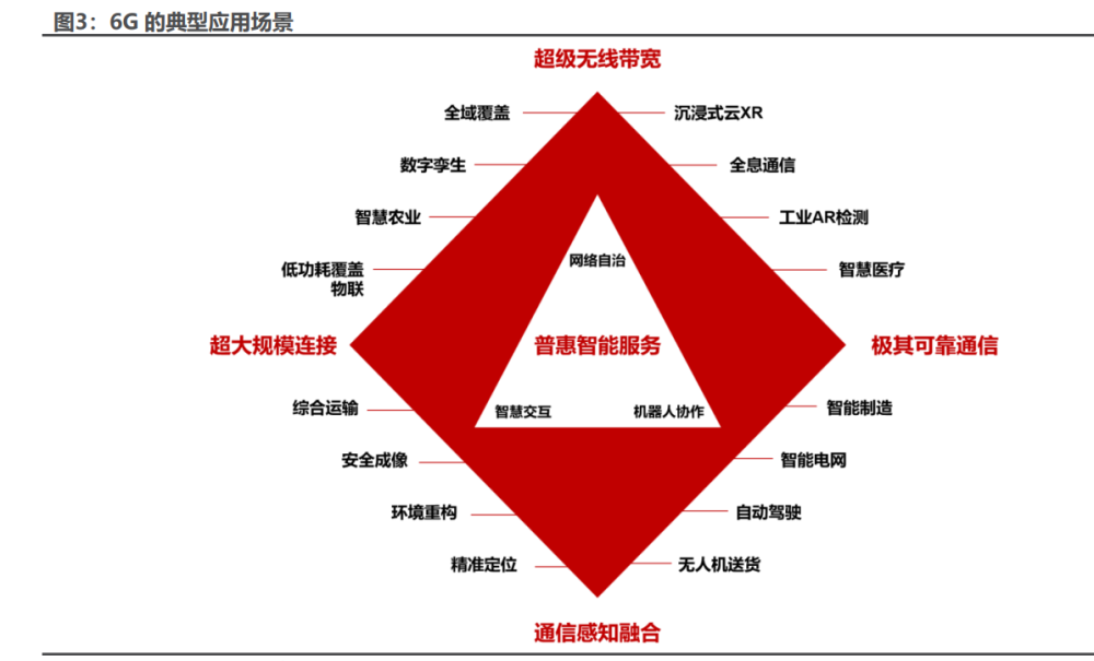 制造业的持续转型升级对 6G 提出新的需求。海量工业数据的实时采集,需 要 6G 与物联网深度融合,通过构建工业数字孪生系统,使工业设计制造虚实结 合以提升智慧工厂的生产效率。智能化工业控制系统需要 6G 提供低时延、超可 靠的网络。智能机器人监测需要 6G 提供超高数据密度和基于边缘的计算能力。 服务业规模增长需要 6G 与数字技术的拉动,催生更多创新应用,丰富数字化服 务、数字金融、孪生医疗、全息教育、元宇宙媒体交互等服务业新场景,满足更 多人群、更多领域的数字生活服务需求,推动服务业纵深发展。 6G 网络有望拓宽网络覆盖范围,及 5G 之所不能及。提升网络覆盖率是对 6G 的核心要求之一,可以让网络信号触达所有边远地区及欠发达地区,同时提升网络的可用性和易用性,提供所有人可无障碍获取、可靠且安全的数字通信技 术和服务,为所有人提供平等网络接入条件,推动数字化成果以更公平的方式惠 及普罗大众。