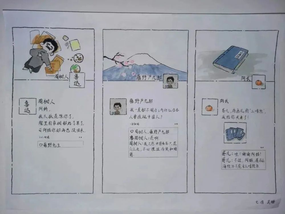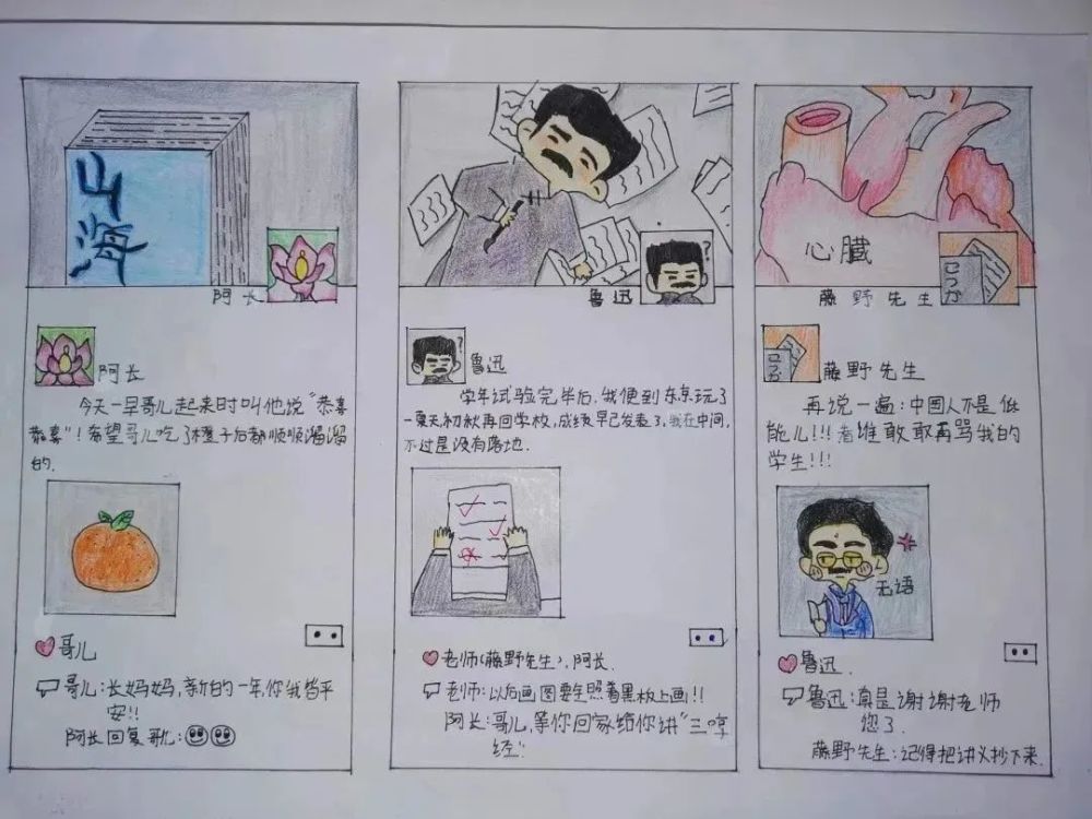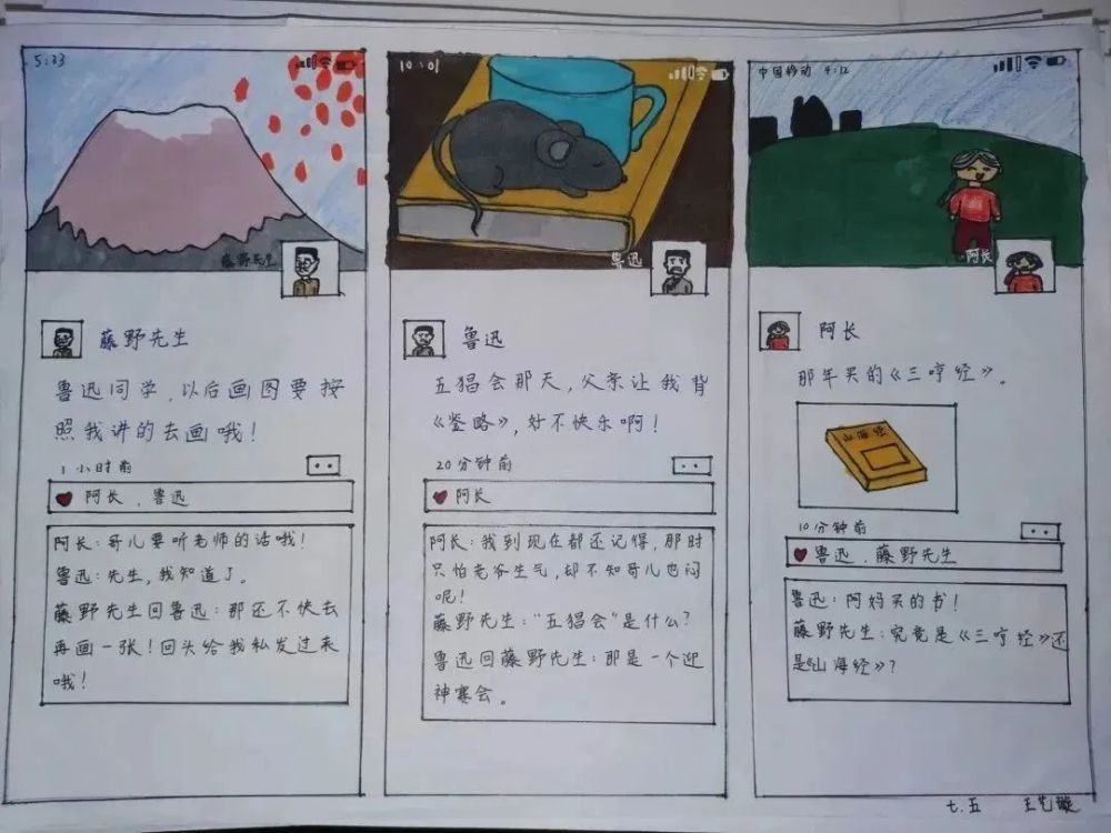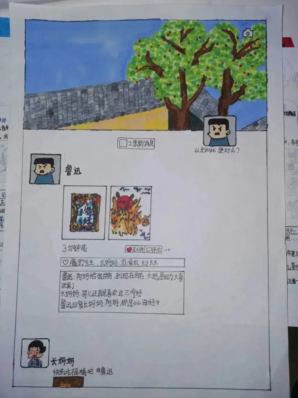 经典是人类智慧的结晶,阅读经典可以涵养品格,启迪智慧。《朝花夕拾》是七年级上册的名著必读书目之一,是鲁迅作品中最富生活情趣的篇章集,我们可以借此了解鲁迅先生从幼年到青年时期的生活道路和心路历程。在认真阅读的同时,同学们也留心朋友圈页面各处细节进行了自主设计,紧扣鲁迅及其师友故人的生活经历,书写了自己对名著中人物的独特感知。