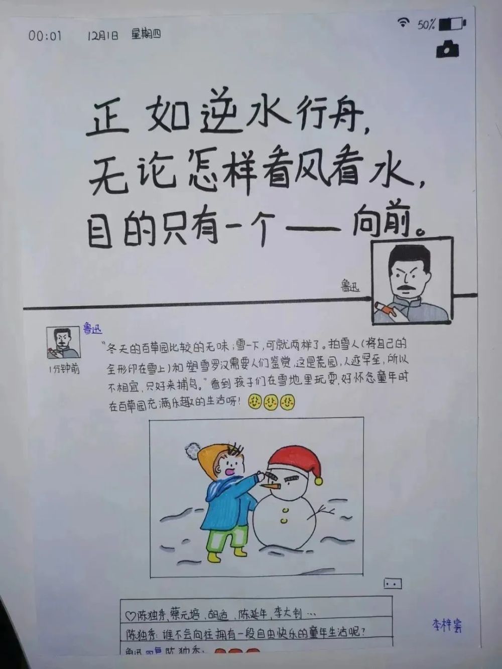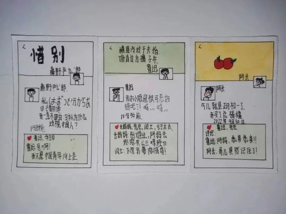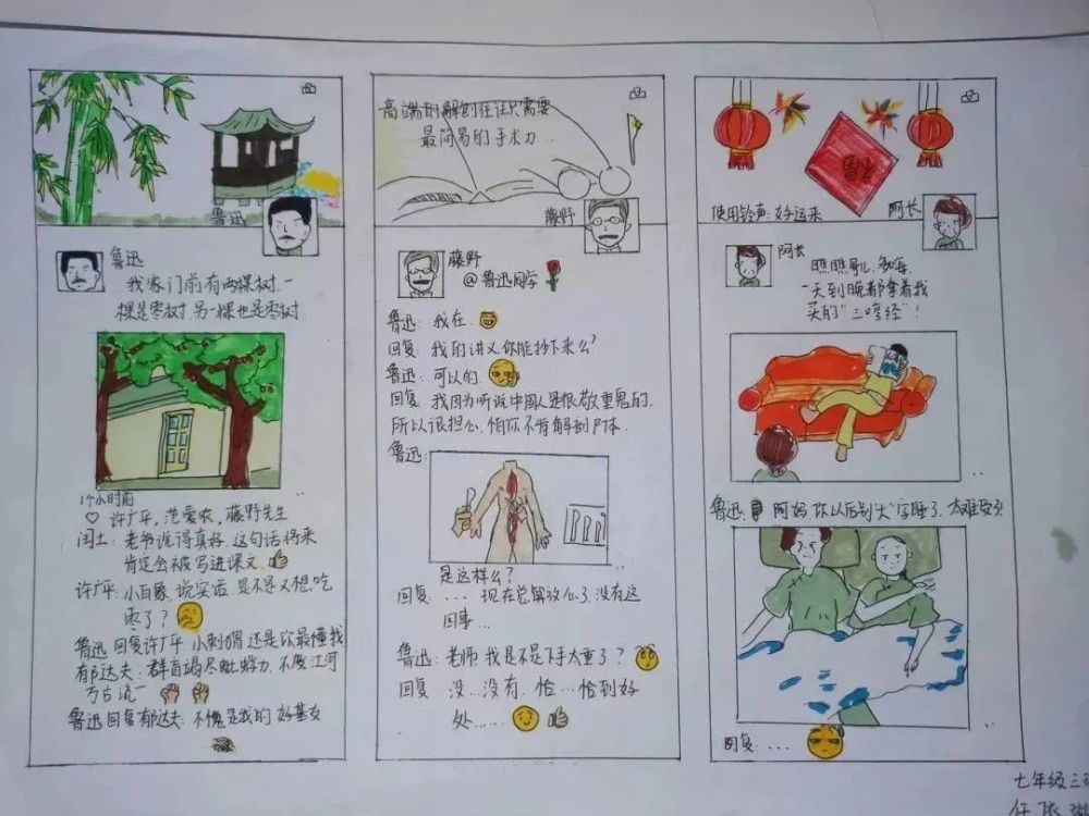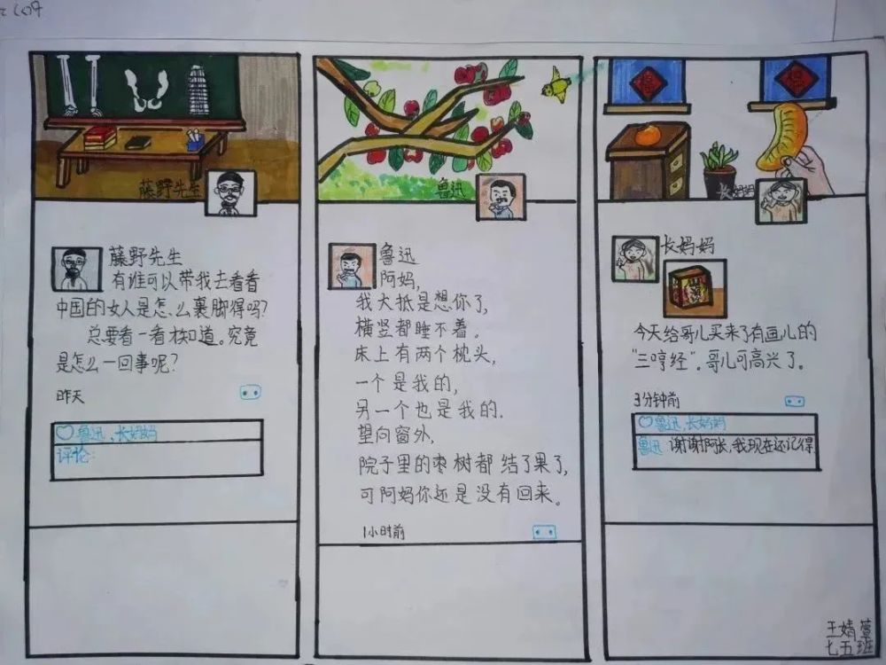 经典是人类智慧的结晶,阅读经典可以涵养品格,启迪智慧。《朝花夕拾》是七年级上册的名著必读书目之一,是鲁迅作品中最富生活情趣的篇章集,我们可以借此了解鲁迅先生从幼年到青年时期的生活道路和心路历程。在认真阅读的同时,同学们也留心朋友圈页面各处细节进行了自主设计,紧扣鲁迅及其师友故人的生活经历,书写了自己对名著中人物的独特感知。