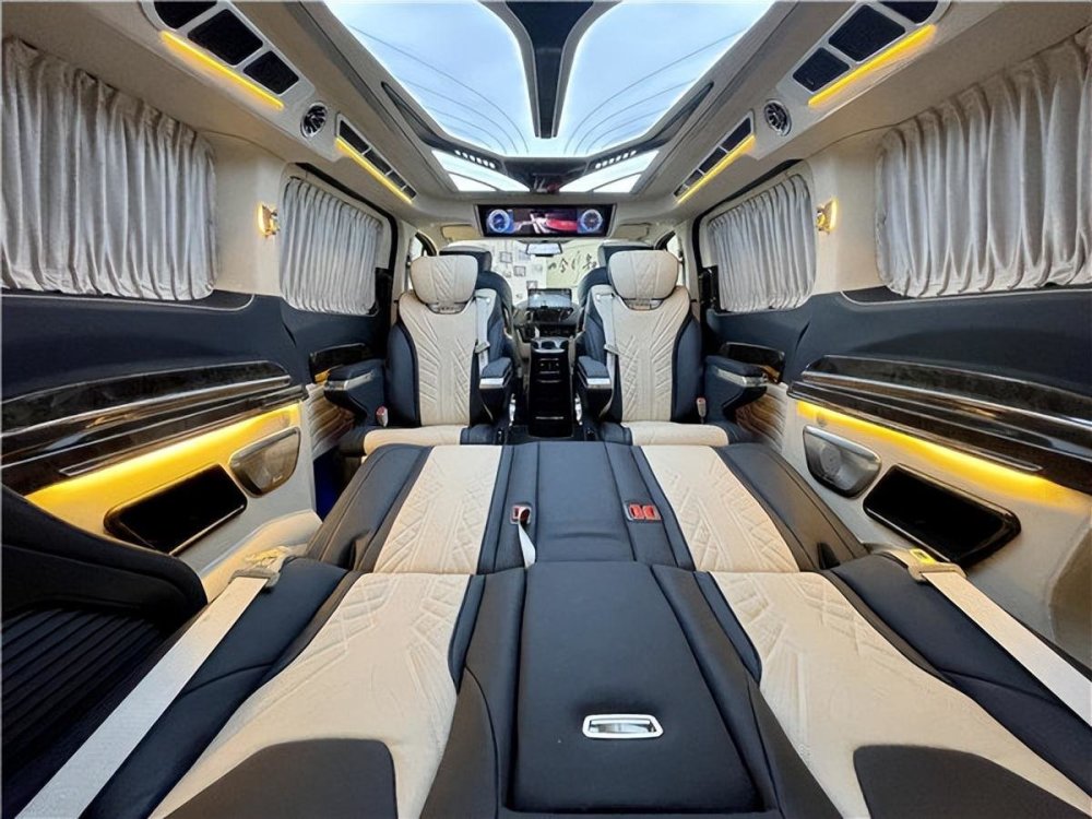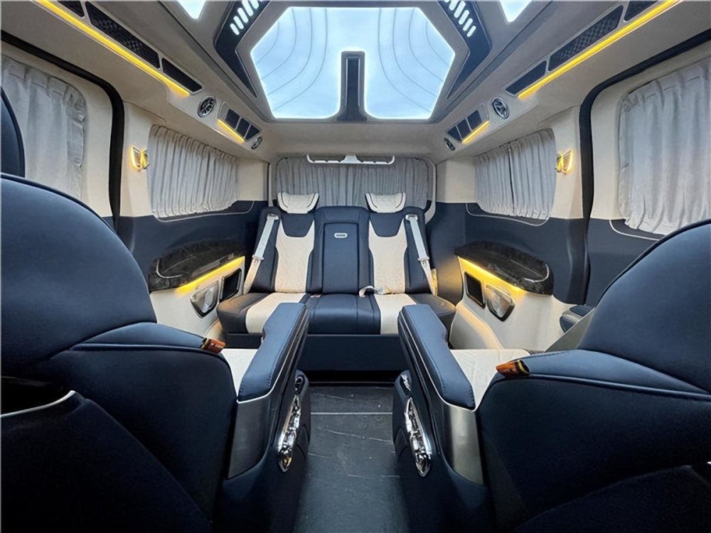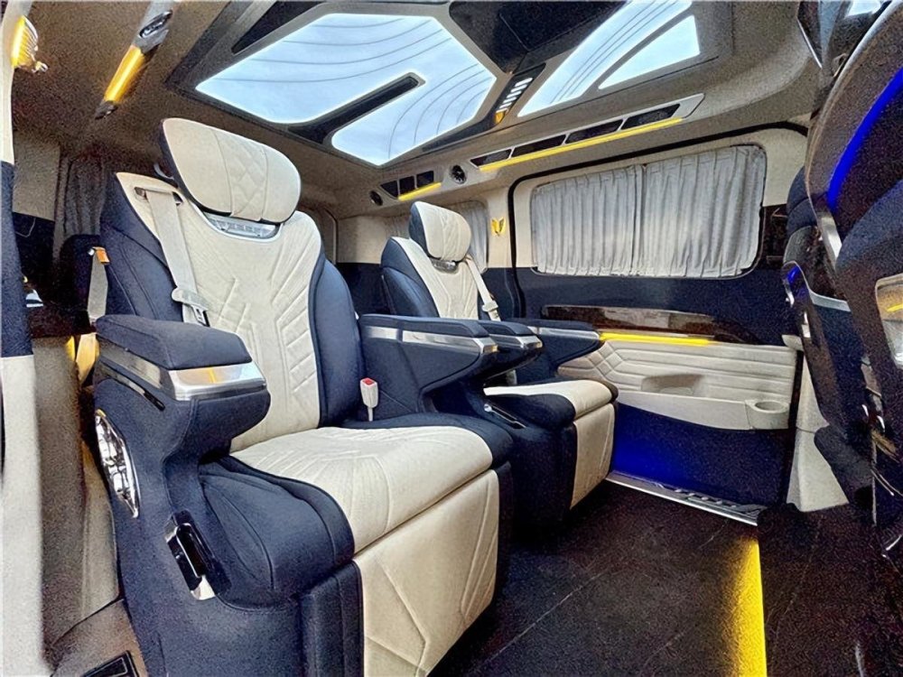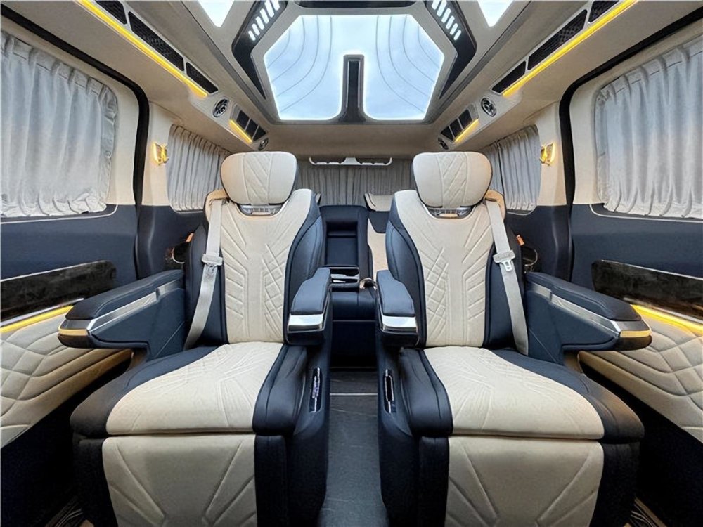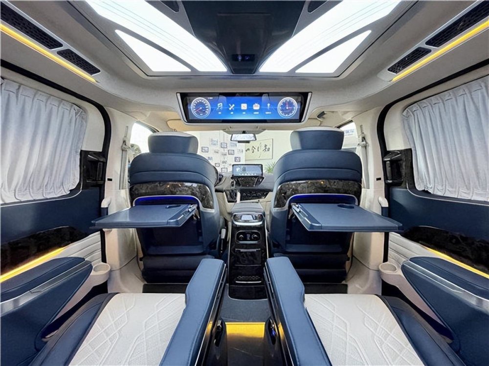 两个独立的座椅采用欧洲进口Nappa小牛皮手工缝制,严格按照人体工程学设计,内置座椅加热、通风、按摩、四段八向调节、座椅记忆、腿拖支撑,乘坐感受非常舒适,宽大的座椅就像是自驾的沙发上一样。支持180度旋转,您可以和第二(三)排乘客对相而坐展开商务洽谈、私密交流、娱乐、K歌,无不方便快捷。二排和三排配置能够拆卸的便捷式商务桌板,放置电脑、文件等物品。