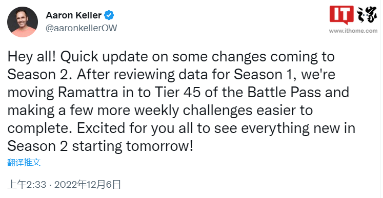 今日,《守望先锋 2》的制作人?Aaron Keller 宣布了一项新改动,在调查了第一赛季的数据后,将新英雄“拉玛刹”降低到了?45 级战令解锁,并让每周挑战变得更容易了。