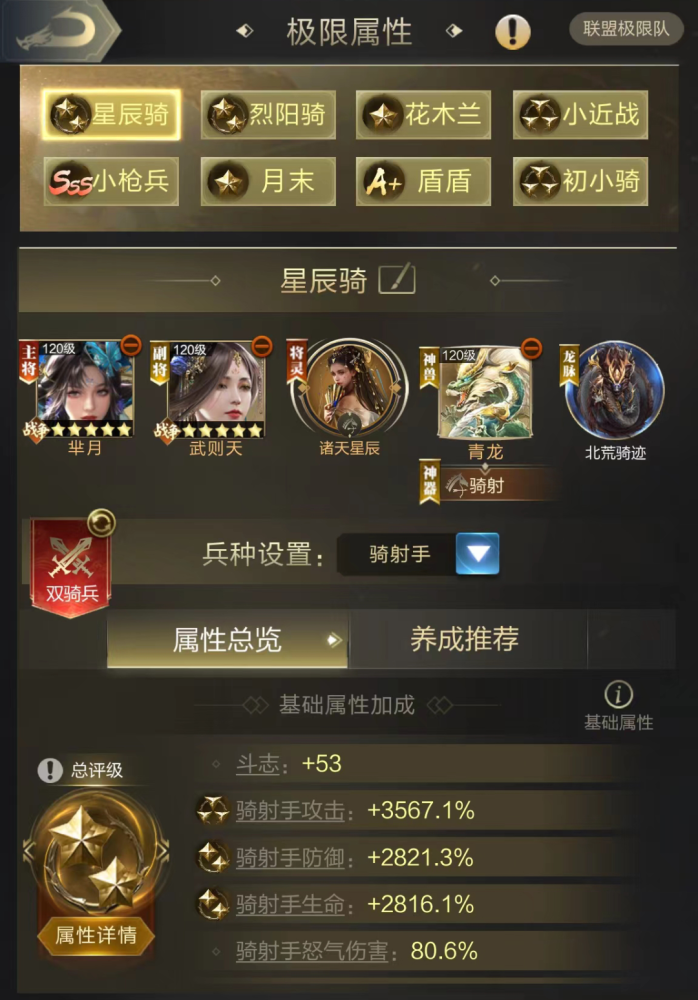 作为盟主,除了创建联盟,既是指挥,也是精神支柱,还是实力担当,拥有在10赛区不错的骑射属性: