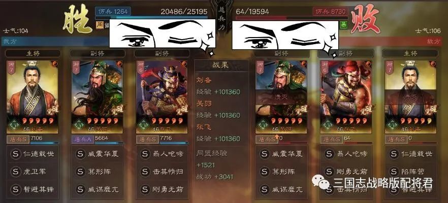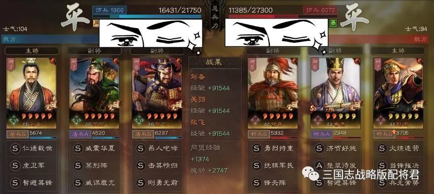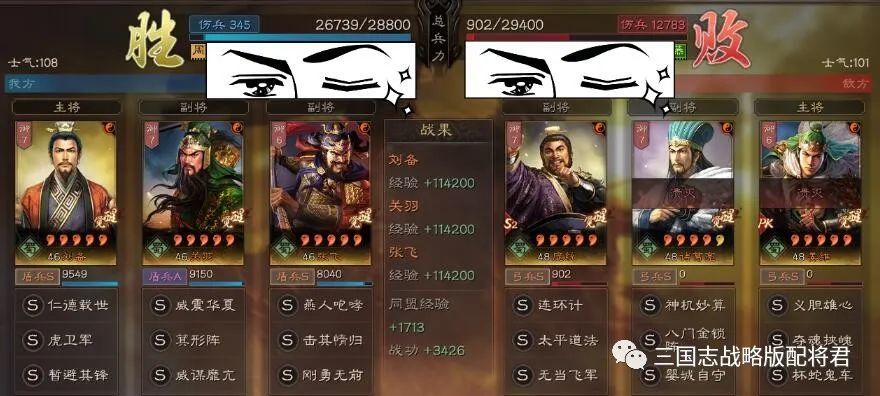 战法没太大好说的,就是在顶配的基础上,把陷阵营换成虎卫军,提高前期的输出伤害,脸好的时候虎卫盾的伤害可以达到七八千,配合张飞前期稳定的输出,拥有比较稳定的兵力压制,从而获得胜利。