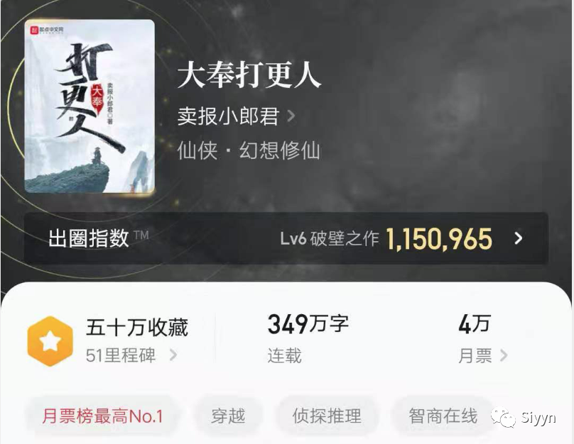 简评:这是2020~2021年的一本爆款仙侠小说,小说讲述了前世是警察的主角许七安穿越到了一个有儒、有道、有佛、有妖、有术士的世界,在这里许七安从底层打更人做起,一路晋升成了当时顶级武夫。这本小说创新性地融合了悬疑、探案、修仙等元素,其中作者的出色文笔以及优秀的人物塑造都让本书增光添彩。