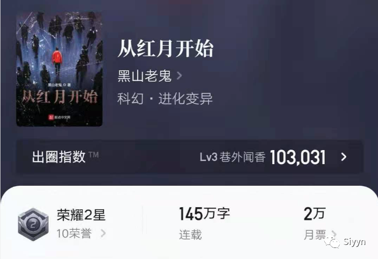 简评:这算是一本“无心插柳柳成荫”的作品,本来黑山大神正在写他的仙侠文,突然大开脑洞又有了这么一部末世科幻类小说,谁知一经发布便成了黑马爆款。小说讲述的是在未来的某天,天空出现了一轮红月,全球人民都疯了。红月出现之后的几十年,人类恢复了秩序,而我们的主角被官方机构发现,征召为了官方调查队。于是,一件件关于主角的隐秘事件被揭开。