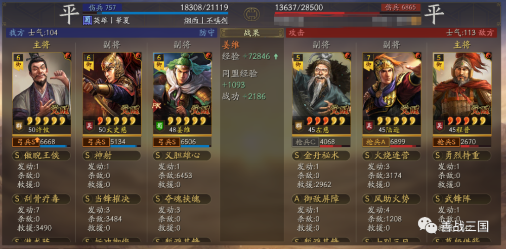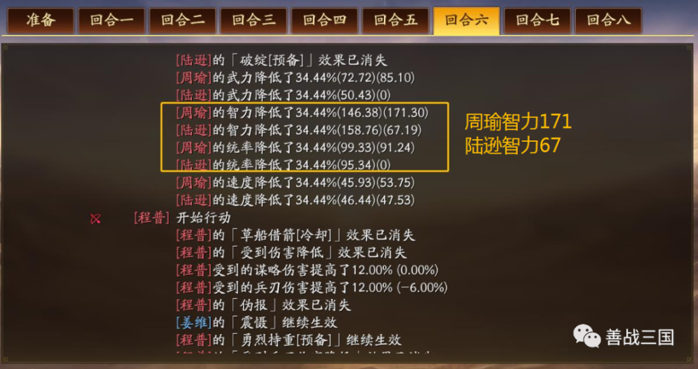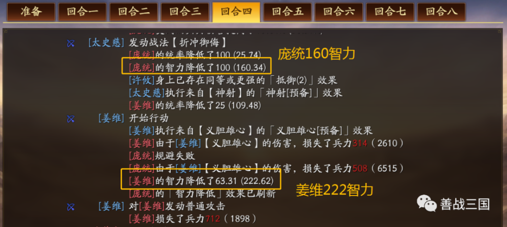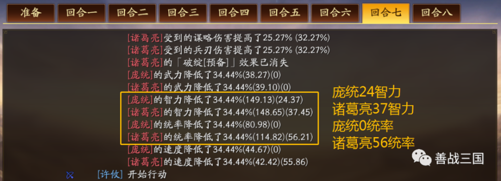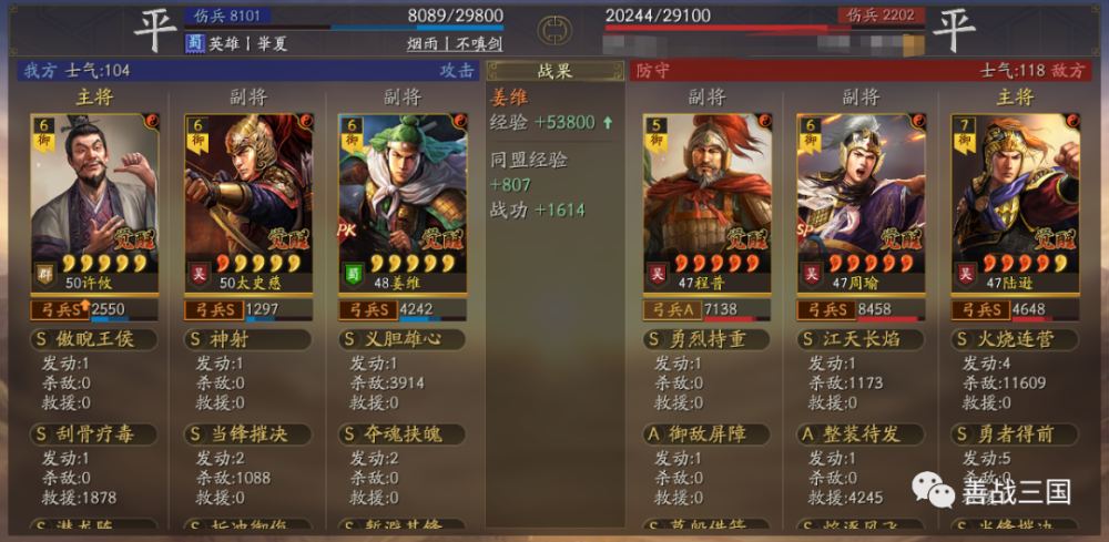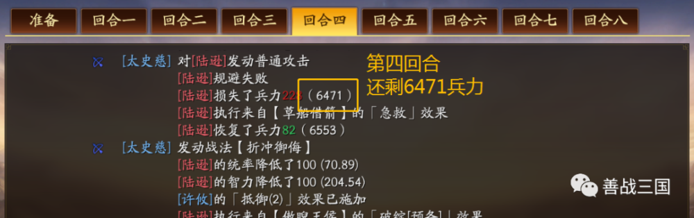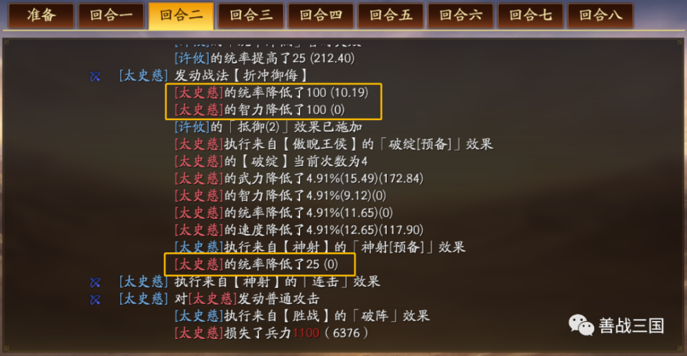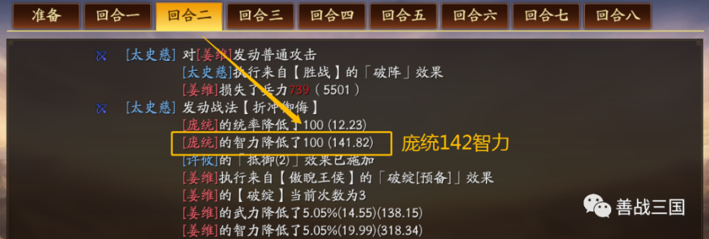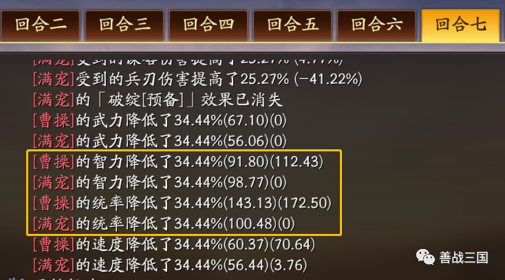 通过上图战报的分析大家大概知道这个阵容的特点了吧?利用了五种减属性战法,把对手的属性大量降低:许攸(全四属性)、神射(统率)、折冲御侮(统率智力)、义胆雄心(智力武力)、夺魂挟魄(全四属性)