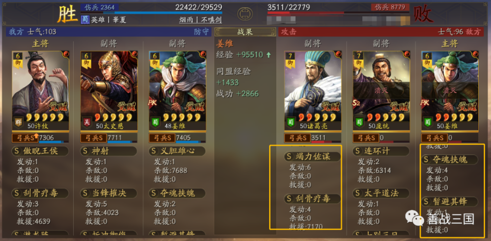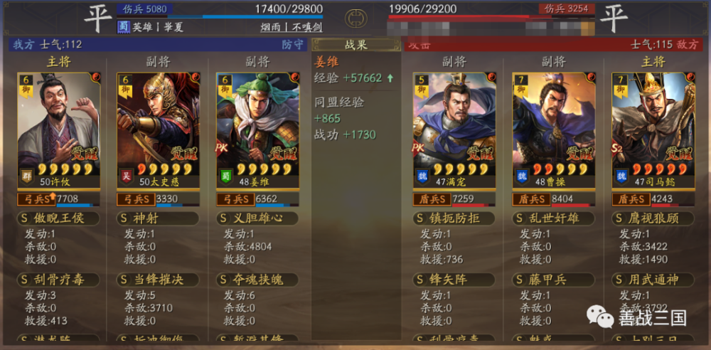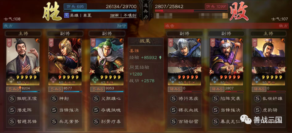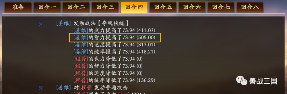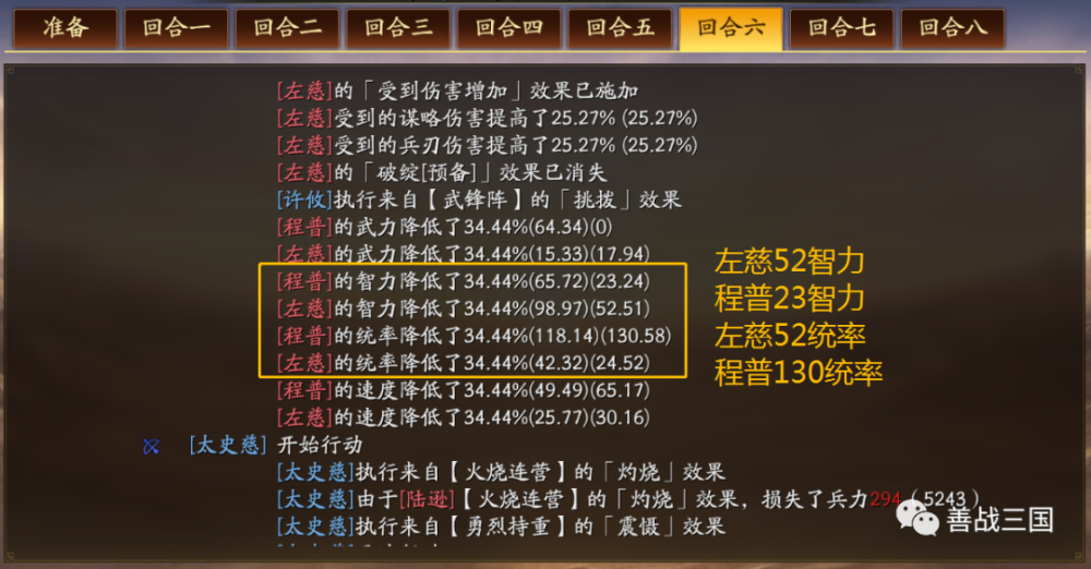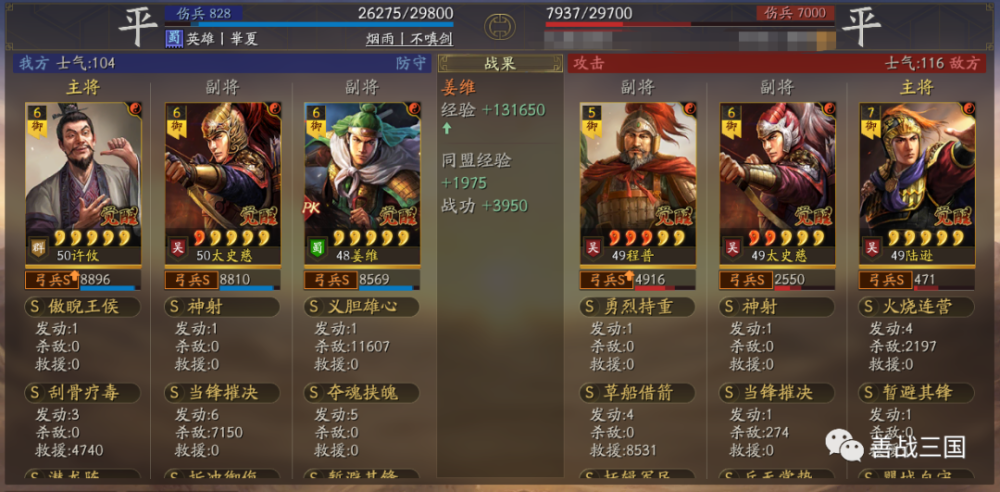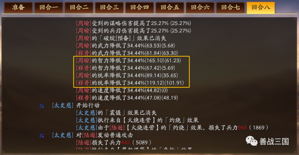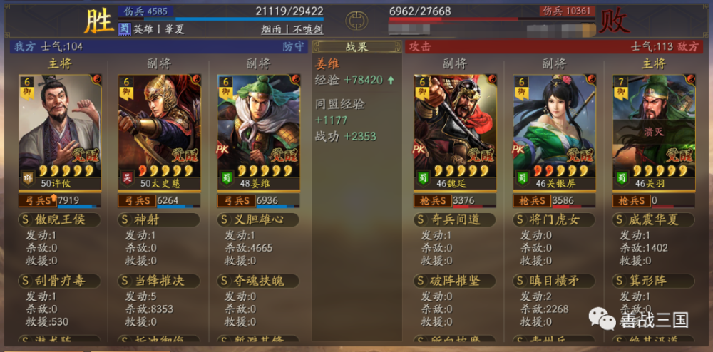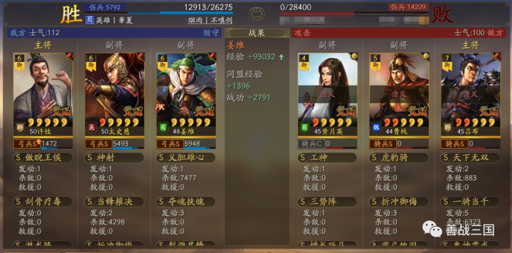 通过上图战报的分析大家大概知道这个阵容的特点了吧?利用了五种减属性战法,把对手的属性大量降低:许攸(全四属性)、神射(统率)、折冲御侮(统率智力)、义胆雄心(智力武力)、夺魂挟魄(全四属性)