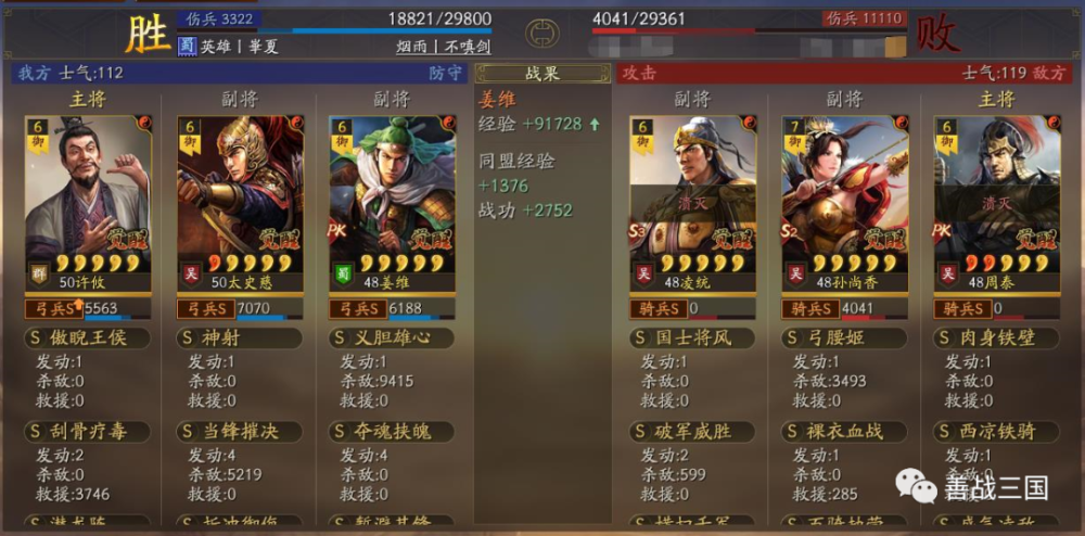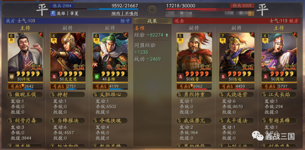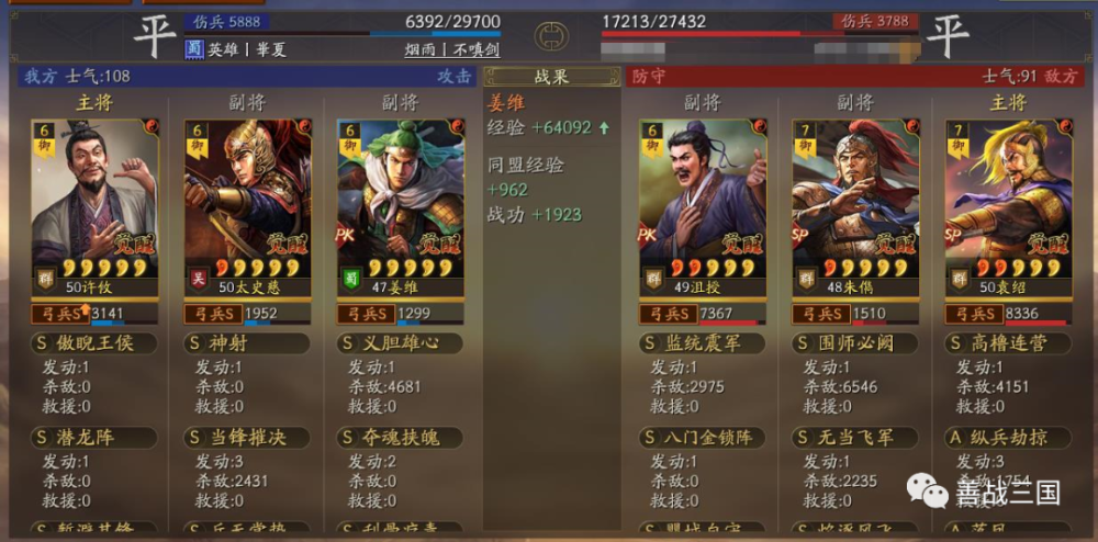 玩家心声:13个赛季的月卡玩家,武将大多是白板,组出这个弓也是只有太史慈1红典藏,想和对手拼红度拼伤害很难做到,索性逆向思维,既然满红和白板武将差了属性,那就把对手拉的比自己属性更低,至少遇到高属性满红阵容时能占便宜,于是就有了这种搭配方式