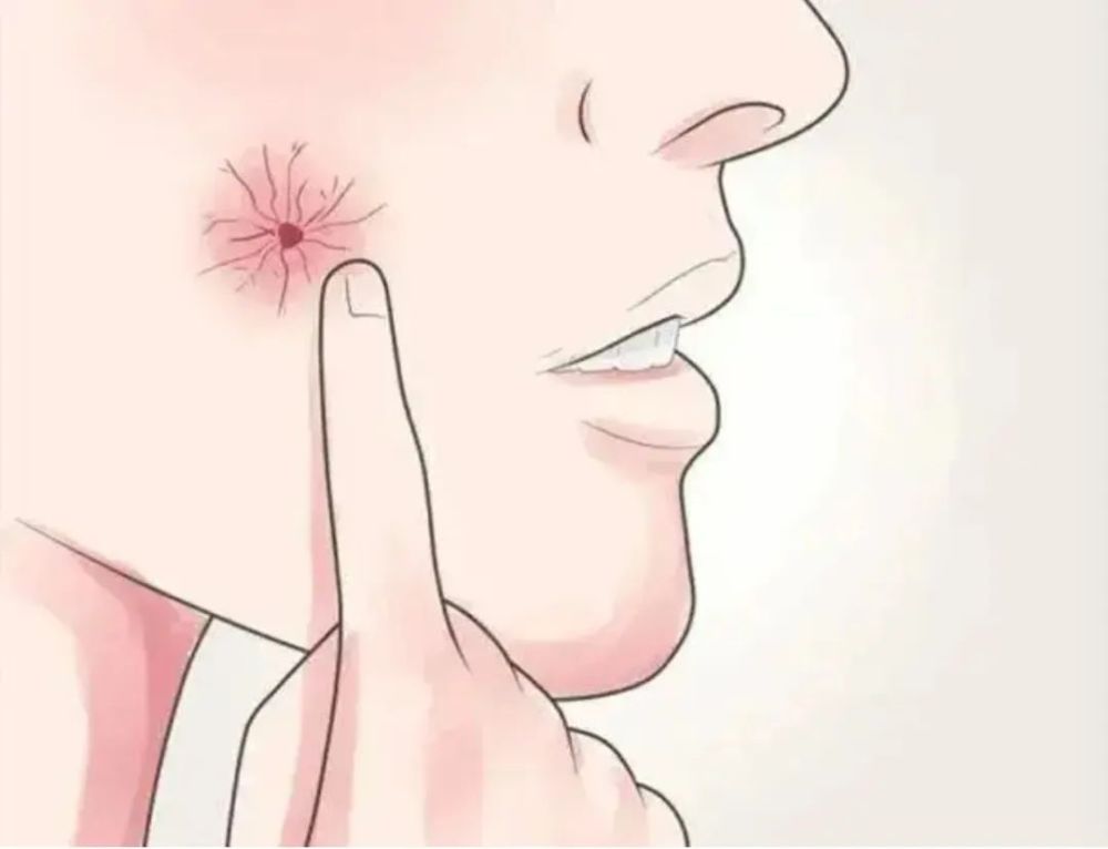 蜘蛛痣本质不是痣,而是一种特发性毛细血管扩张症。皮肤中间有一个?红点,周围像蜘蛛的爪子伸出来,如果用一根火柴棒按压红点,周围的“爪子”会消失不见。