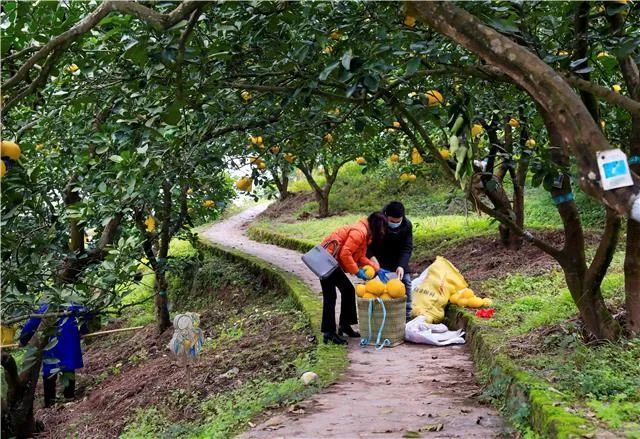 12月6日,万石耕春·梁平柚海,游客在采摘预购的柚子。