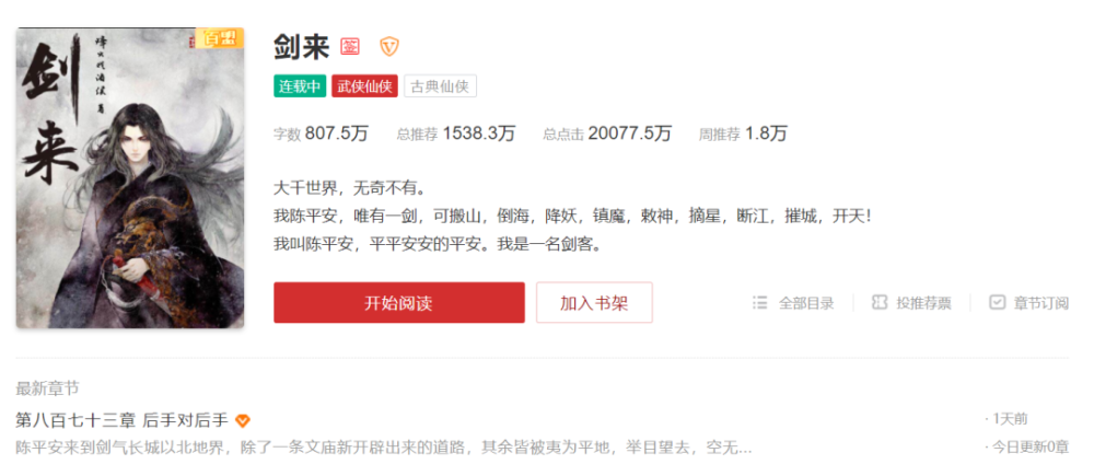 《剑来》目前在纵横中文网已连载807.5万,总推荐破一千五百万,点击破两亿!