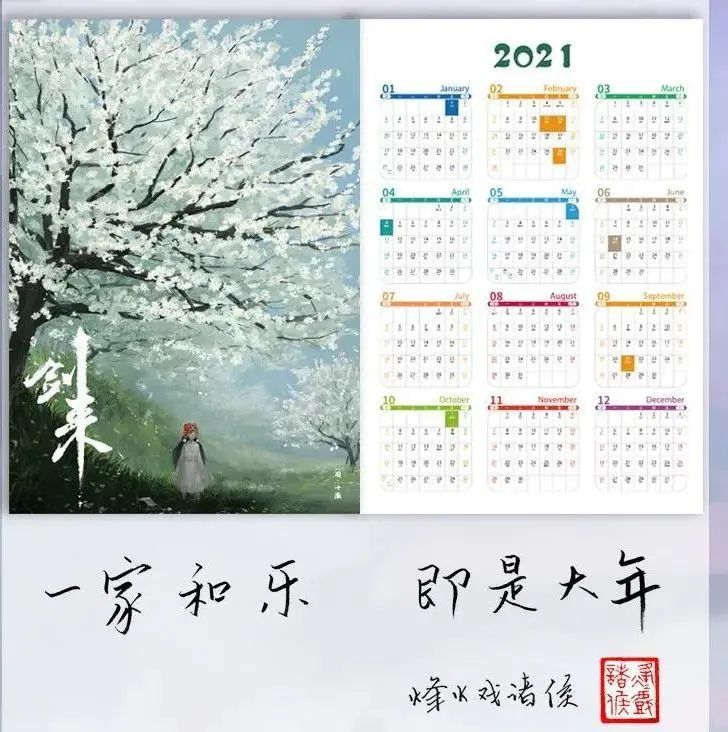 年历:共一张。年历正面是读者温十澈画的白也;背面则是2021年十二个月的月历,重要节日还有特别标识。既美观,又实用。