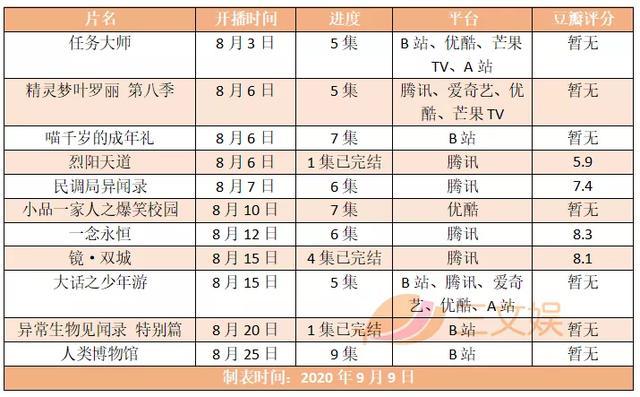 八月上新的动画中,腾讯视频独播动画有4部,包括腾讯第一部2D年番动画《一念永恒》,另外3部也是话题之作;B站有3部,然而B站独播的这3部动画中有1部是仅1集的特别篇,剩余2部都是每集只有一两分钟的泡面番,可见B站把主要精力都放在了七月动画上了;优酷八月有1部独播动画,而原本计划在暑期档上线的大制作独播动画《秦时明月之沧海横流》却依然不见踪影,另一部原定暑期档与B站联合播出的动画《芯觉》目前确定推迟到了十月,优酷今年夏天在国产动画方面显得稍微单调。