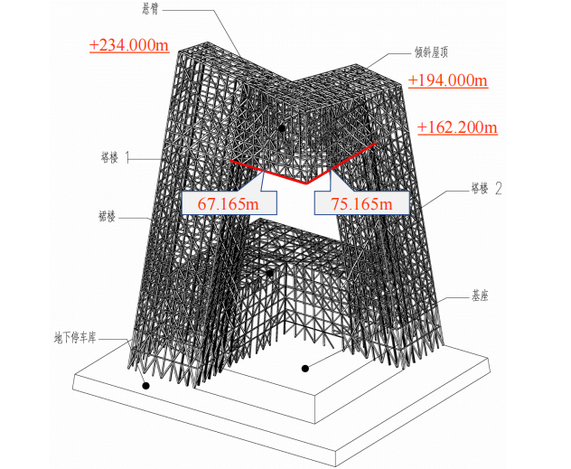 “央视新址大楼是我亲历项目中的工程难度的代表。”据张琨介绍,央视大楼结构非常复杂。“它的垂直部分实际上是倾斜的,我们叫做双塔楼向内倾斜6度。”而它顶部又有L型的双向悬挑,“塔楼1悬臂外伸67.165m,塔楼2悬臂外伸75.165m,仅悬臂部分总重量约1.8万吨,相当于一般规模的工程钢结构的总量。”另外,项目还有一个悬臂结构,距离地面162.2米。