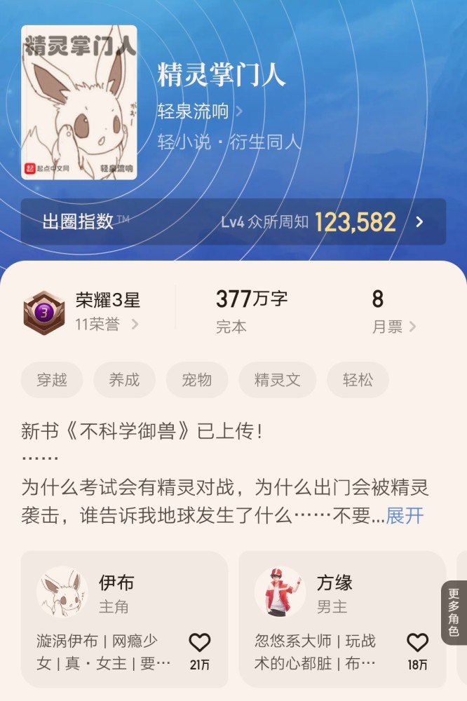 当然如果把宝可梦的相关同人也算上去的话,这个成绩要更好一些。不过其创造者还是轻泉流响自己,因为他的上本小说《精灵掌门人》最后完结时的均订就有两万四,创造了起点宝可梦同人的最高纪录。