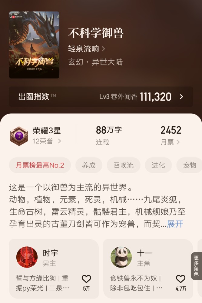 而这期就来说说轻泉流响的新书《不科学御兽》,恰巧我也在追更,就看到他的月末总结了。