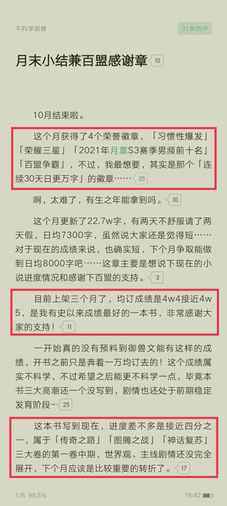 在这份“总结兼感谢”的单章里,轻泉流响汇报了一下成绩,以及小说写作的进度。其中提到《不科学御兽》的均订已经接近四万五,是他所有作品中成绩最好的一本。