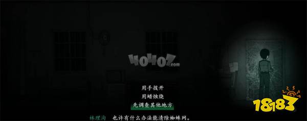 在拿完道具之后我们再次回到诊所中,这里并没有什么东西可以获得,调查的内容也都是一些场景设定。之后我们向右走,回到自己醒来的病房。之后再继续向右走,能够看到一扇被蜘蛛网密封的门,这里我们可以通过调查,用蜡烛烧掉蜘蛛网,就能够开门离开了。