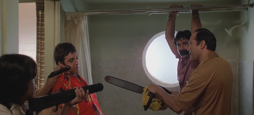 其实类似于《疤面煞星》的黑帮电影的社会意义之一就是借老大们辉煌发家史和一切都会没落的结尾来深刻的告诉了我们:很多坏人并不是想我们想象的那样快乐的。这个看起来很成功的套路,怎么看怎么像编出来聊以自慰的精神安慰。我们可以说,看,老大也是非常不快乐的。托尼,最后在餐馆里面大闹一通时的酒话,就是这样。你们可以指着那个人说,看,他是个坏人,借以显示自己是个好人。如果不是性格上的偏执,这个古巴移民的故事就不是一个悲剧而是一部“成功的奋斗史”,并且可以说是“美国梦”的一个“成功”典范