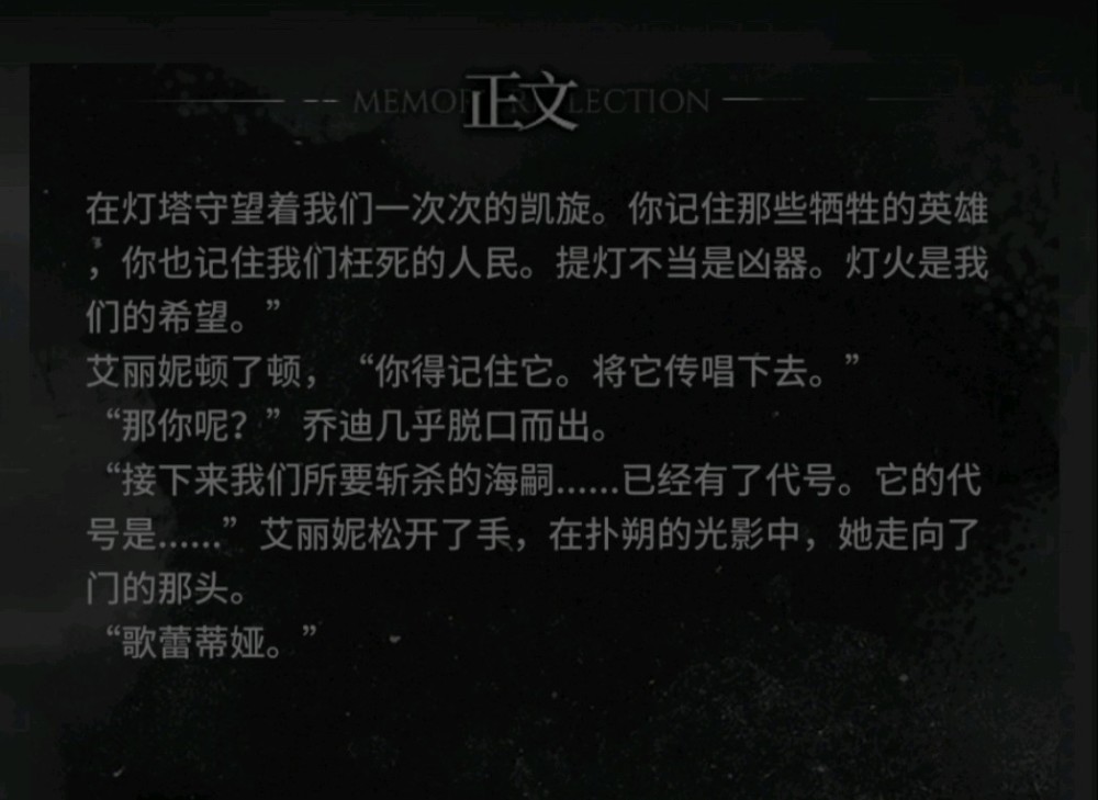 “接下来我们所要斩杀的海嗣,已经有了代号,它的代号是......”艾丽妮松开了手,在扑朔的光影中,她走向了门的那头。“歌蕾蒂娅。”