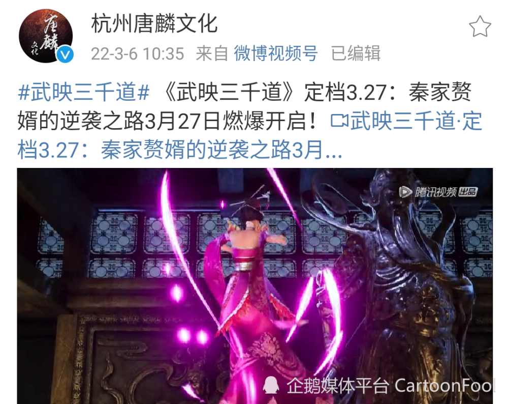 3月6日,杭州唐麟文化官博宣布了动画《武映三千道》的定档时间——3月37日,每周日上午10点准时开播。