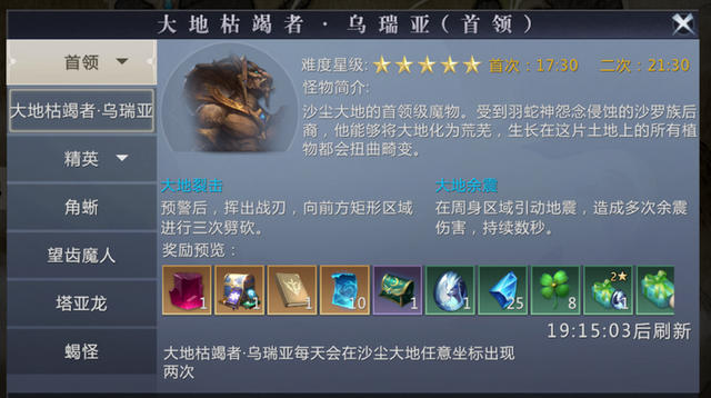 而再说到如何攻略秘宝首领这个活动,首先目前地图上总共有风车镇、冰封北岸村、沙罗旧地、沙尘大地以及卡利亚边境林地五个地方会刷新秘宝首领,每个首领一天会在固定时间刷新两次,具体的刷新时间游戏系统里也会通知。