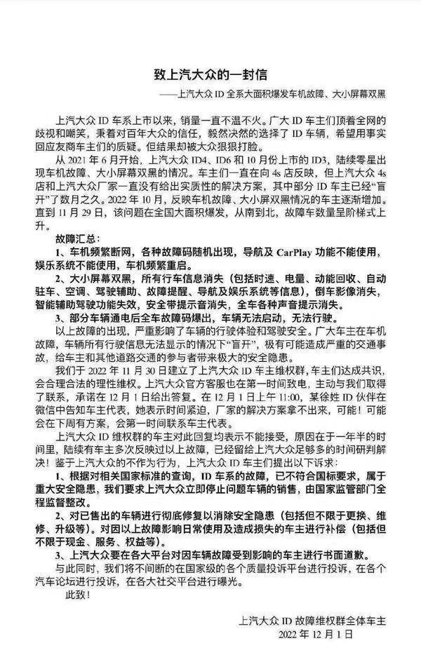去年年底,一则《致上汽大众的一封信》在网络上流传开来。针对上汽大众ID.纯电家族产品大范围的车机黑屏故障问题,车主们指出:包括车机频繁断网、大小屏幕双黑以至于行车信息消失、部分车辆通电后全车故障码爆出和车辆无法正常启动行驶等问题在内,皆严重影响驾驶体验、威胁驾驶安全。